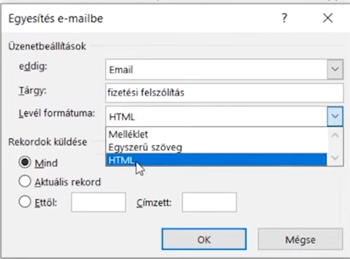 A tárgy tetszőleges. A formátumnál a HTML és az egyszerű szöveg közül választhatsz. A HTML megtartja a formázást, a szöveg nem. A „mellékletként” opciót ne használd, mert a címzett üres levelet kapna csatolt melléklettel, amit sok spam szűrő letilt.