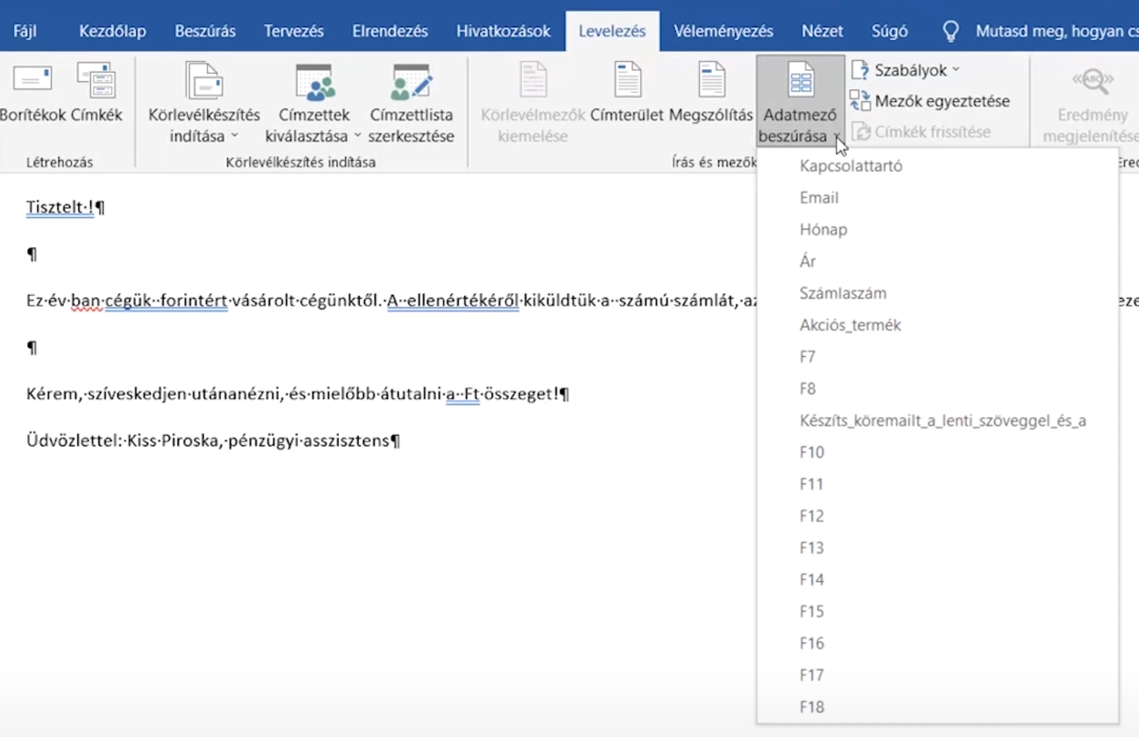 A mezők beszúrásához állj a megfelelő helyre a szövegben. Például a „Tisztelt” után, a felkiáltójel elé. A szalagon válaszd az Adatmező beszúrása lehetőséget, és válaszd ki az oszlop nevét – például „Kapcsolattartó”.