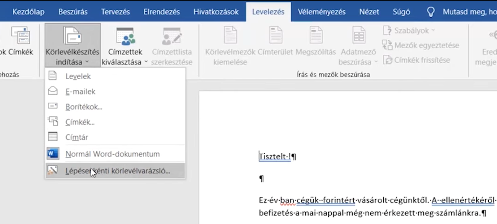 Kattints a Levelezés menüpontra. A harmadik ikon a Körlevélkészítés indítása. Válaszd alul a Lépésenkénti varázslót.